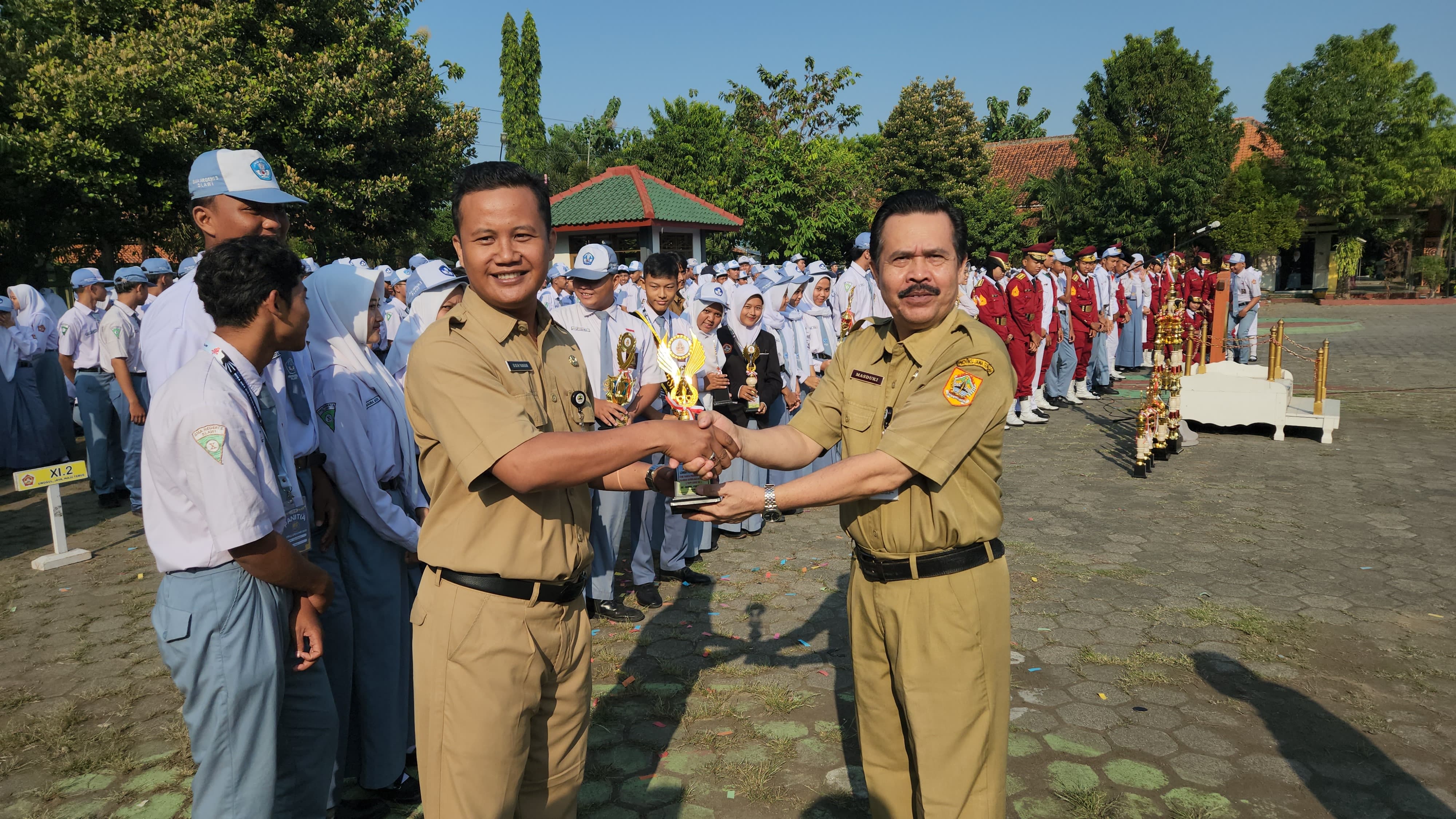 Setelah rangkaian upacara dan pembukaan MPLS selesai, dilanjutkan pemberian apresiasi kepada siswa yang berhasil membawa nama baik sekolah. Banjir piala agaknya tepat disematkan hari ini. Berikut apresiasi yang diraih oleh siswa kelas XI dan XII ;